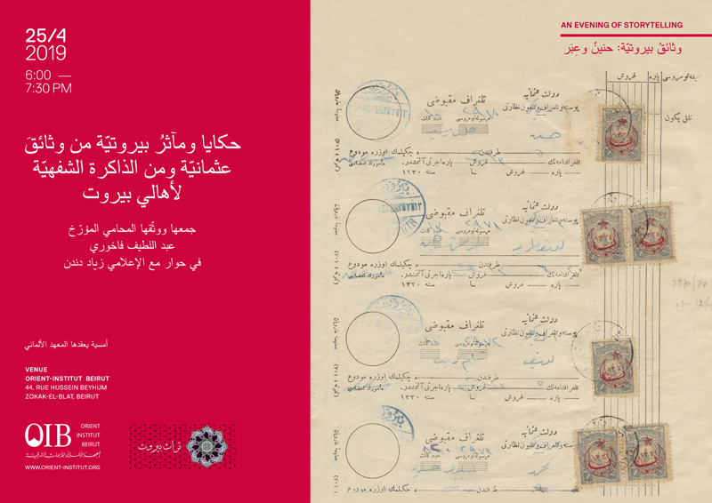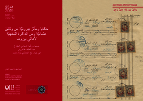 وثائق بيروتية.. حنين وعبرة، أمسية نسترجع فيها تاريخ بيروت من أواخر القرن التاسع عشر حتى عشرينات القرن العشرين مستندين إلى ما جمعه ودقّقه ووثّقه الأستاذ المؤرخ عبد اللطيف فاخوري من وثائق عثمانية من أرشيف المحاكم الشرعية، ومراسلات ومذكرات الدبلوماسيين من سفراء وقناصل، وكذلك من شعر الشعراء وكتابات الأدباء والمؤرخين الأوائل