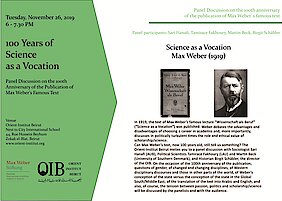 In 1919, the text of Max Weber’s famous lecture “Wissenschaft als Beruf” (“Science as a Vocation”) was published. Weber debates the advantages and disadvantages of choosing a career in academia and, more importantly, discusses in politically turbulent times the role and ethical value of scholarship/science.