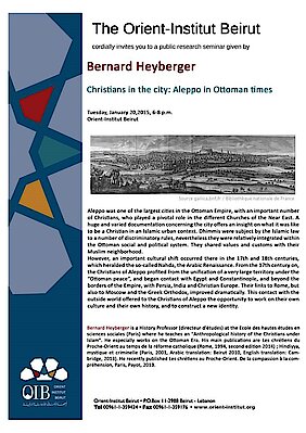 Bernard Heyberger is a History Professor (directeur d'études) at the Ecole des hautes études en sciences sociales (Paris) where he teaches an "Anthropological history of the Christians under Islam". He especially works on the Ottoman Era. His main publications are Les chrétiens du Proche-Orient au temps de la réforme catholique (Rome, 1994, second edition 2014) ; Hindiyya, mystique et criminelle (Paris, 2001, Arabic translation: Beirut 2010, English translation: Cambridge, 2013). He recently published Les chrétiens au Proche-Orient. De la compassion à la compréhension, Paris, Payot, 2013.