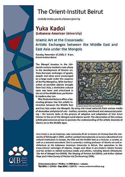 Yuka Kadoi is an art historian, who received a Ph.D. in Islamic art history from the University of Edinburgh in 2005, and has worked internationally at various educational and cultural institutions in Europe, the USA and the Middle East as a lecturer, a curator, as well as a research consultant. She is currently a visiting professor of Islamic art and architecture at the Lebanese American University in Beirut. She specializes in the cross-cultural exchanges of objects, images and ideas in pre-modern Islamic Eurasia and has written or edited numerous books and articles, including Islamic Chinoiserie: The Art of Mongol Iran (2009); The Shaping of Persian Art (2013); and Arthur Upham Pope and A New Survey of Persian Art (forthcoming 2016).