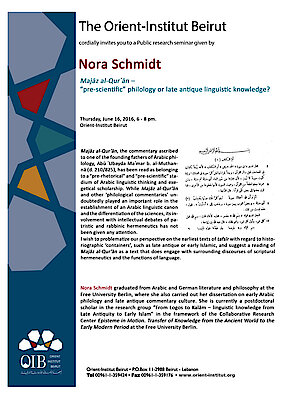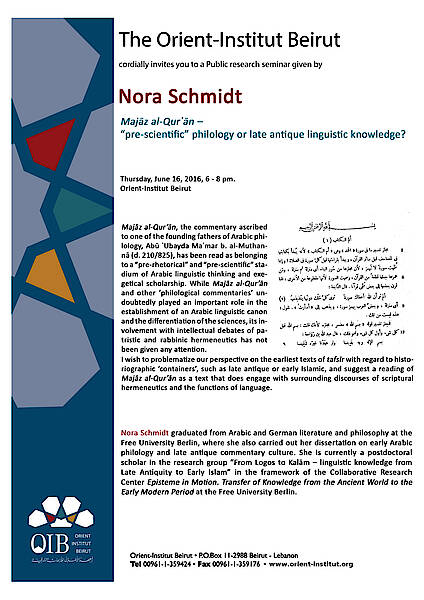 Nora Schmidt graduated from Arabic and German literature and philosophy at the Free University Berlin, where she also carried out her dissertation on early Arabic philology and late antique commentary culture. She is currently a postdoctoral scholar in the research group “From Logos to Kalām – linguistic knowledge from Late Antiquity to Early Islam” in the framework of the Collaborative Research Center Episteme in Motion. Transfer of Knowledge from the Ancient World to the Early Modern Period at the Free University Berlin.