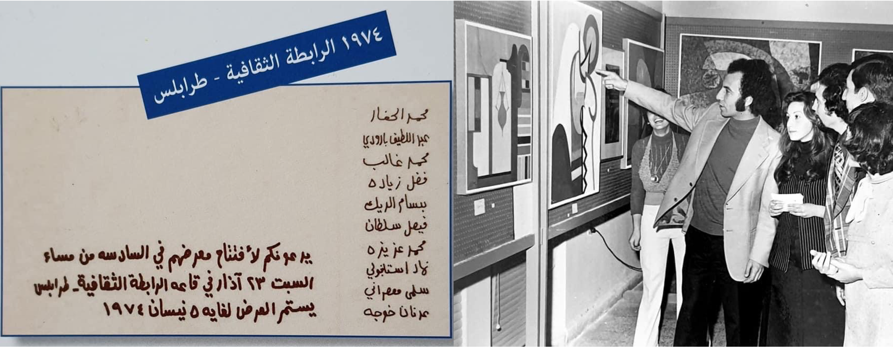 First exhibition of the “Group of Ten”, 1974, Cultural Association Tripoli: Invitation card (left) and Fadl Ziadé showing his paintings (right). Courtesy Fadl Ziadé.