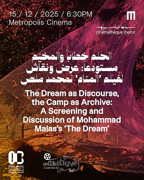 Following the screening of The Dream, Ali AlAdawy will lead a discussion on the intersections between the film and the book The Notebook of The Dream. AlAdawy interrogates the concept of the “militant film” through the tension between the presence of the Palestinian cause in the collective imagination, consciousness, and ideology—whether in wakefulness or in dreams—on the one hand, and the absence of people as subjects and as a community that has historically fought for the Palestinian cause, on the other. How does the film visually embody this tension? What other texts and imaginaries do the two works evoke? And what remains outside the frame regarding the processes of producing and making the film?