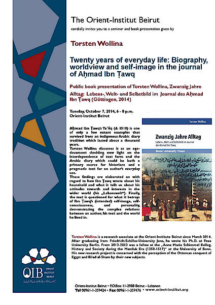 Dr. Torsten Wollina is a research associate at the Orient Institute Beirut since March 2014. After graduating from Friedrich-Schiller-University Jena, he wrote his Ph.D. at Free University Berlin. From 2012-2013 was a fellow at the „Anne Marie Schimmel Kolleg. History and Society during the Mamluk Era (1250-1517)“ at the University of Bonn. His new research project is concerned with the perception of the Ottoman conquest of Egypt and Bilad al-Sham by their new subjects.