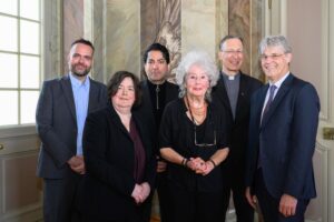 From left to right: Dirk Hartwig, Prof. Dr. Ines Weinrich, Prof. Dr. Mouhanad Khorchide, Prof. Dr. Dr. h. c. mult. Angelika Neuwirth, Prof. Dr. Dr. Felix Körner SJ, Prof. Dr. Michael Quante, © ZIT/Michael C. Möller, Universität Münster