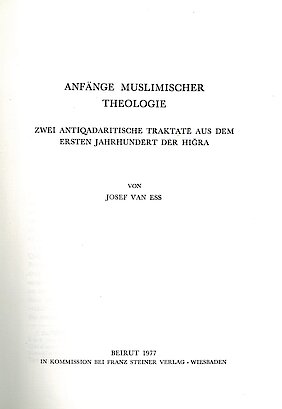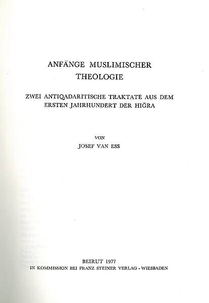 This work focuses on the early Muslim dispute against the qadarīya based on two manuscripts. Prof. van Ess illustrates this dispute based on the writing of Ḥasan b. Muḥammad b. al-Ḥanafīya in the first part of the volume. After introducing the author and its work, he illustrates the chosen manuscripts and offers a translation for them.