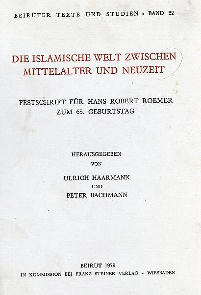 This publication is a collection of essays concerning the Islamic world between the middle Ages and the modern era, which is a Festschrift for the scholar Hans Robert Roemer.