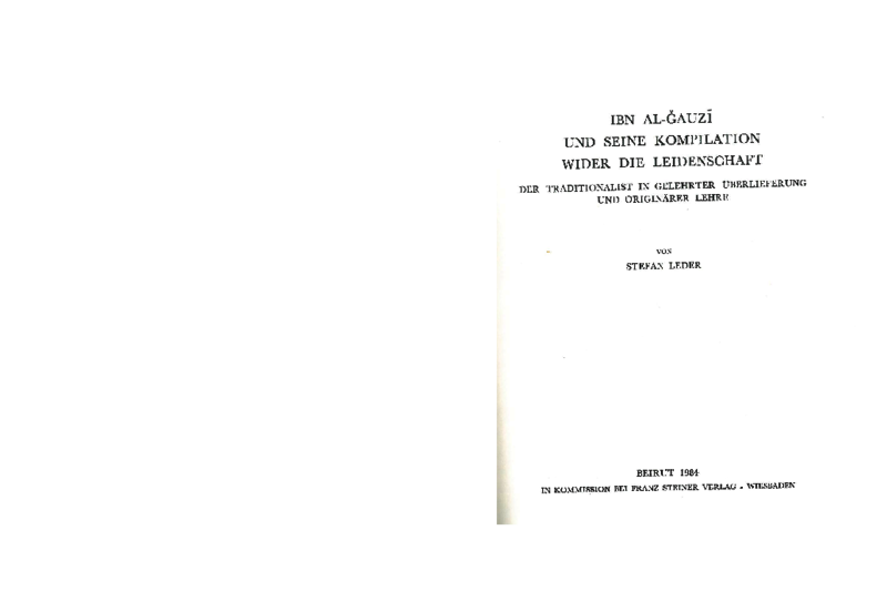 In his revised doctoral thesis, Prof. Leder deals with Abū Farağ Ibn al-Ǧauzī and his Ḏamm al-hawāʾ. After the introduction of the author’s life and the compilation of his work Ḏamm al-hawāʾ, Leder illustrates in the transmissions of scholars mentioned in the text.