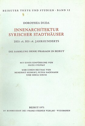 This work is based on a collection of the Pharaon family in Beirut. In the first part, the author gives an explanation about the family Pharaon. In the second part, she continues with the cataloguing and explanation of the two houses of the Pharaon family in Aleppo and Damascus. In the third part, Duda describes the inscriptions found in these two buildings.