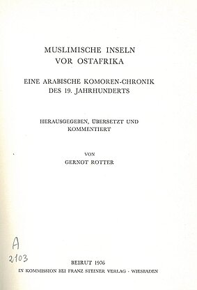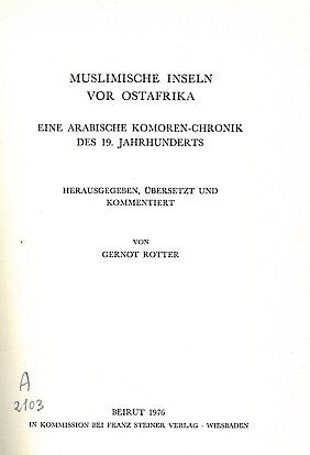 The work of Dr. Rotter deals with the history of the Muslims Islands near East Africa that is contained in the Comoros chronicles of the 19th century. In the first part of the work, Rotter introduces the translation of the text written by Qāḍī ʿUmar with background information on the author and the inscription used for the translation. In the second part, he provides a translation of the manuscript attached to the text.